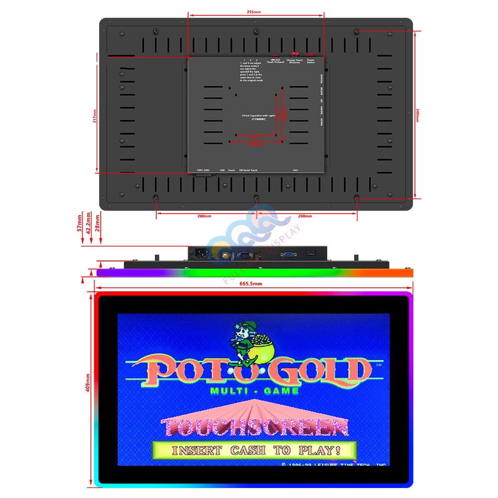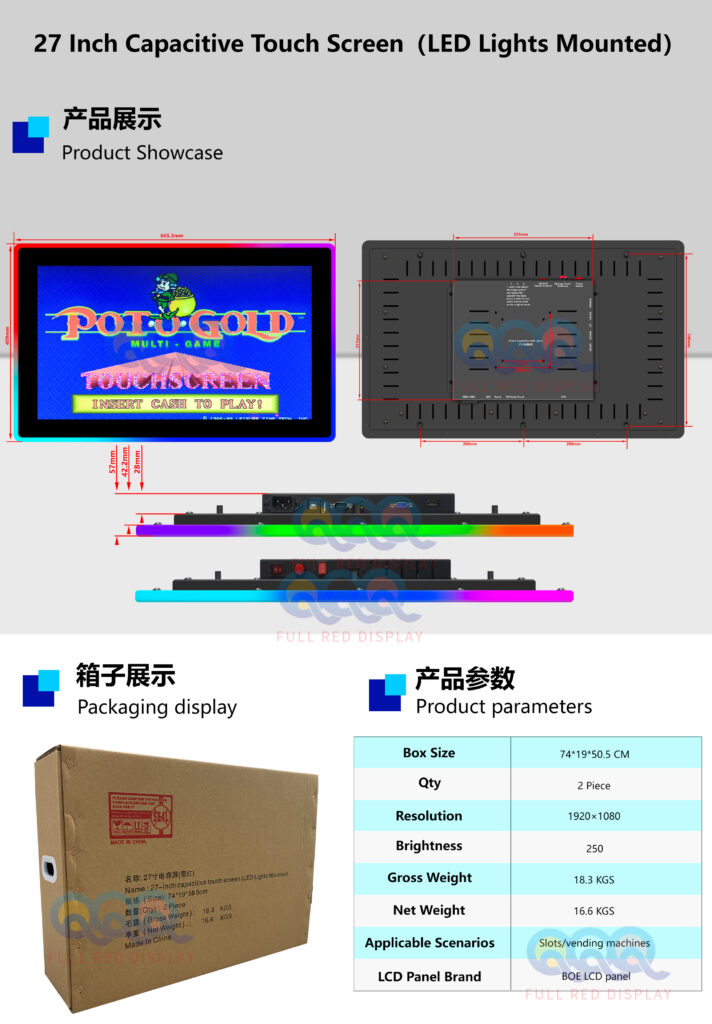 27″ POG Touch monitors are designed for the gaming industry Wildly Used In Game; VGA HDMI as video input; Multi points touchscreen with RS232 and USB interface;compatible for American Roulettee,Pot O Gold,Life Of Luxury and Cherry Master etc.Most of Customer will use it on Dual Monitors Cabinets in Game or Single Monitors Cabinest. Its Highly Demand in Game. It comes with an external LED controller to achieve desired color combinations ,You Can Adjust Model Lights ,Speed Of The Lights