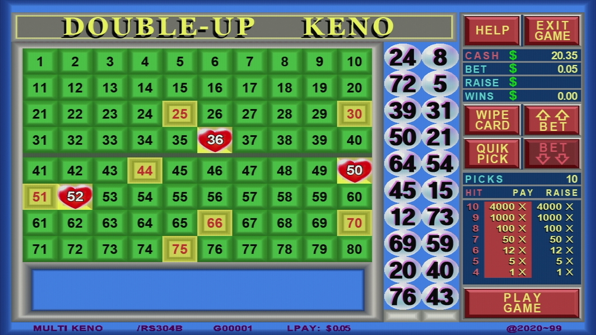 Texas Keno Game Board